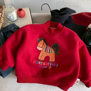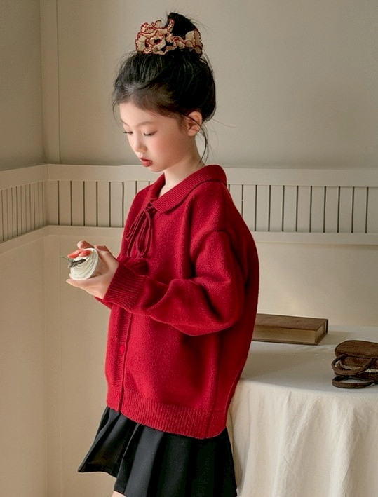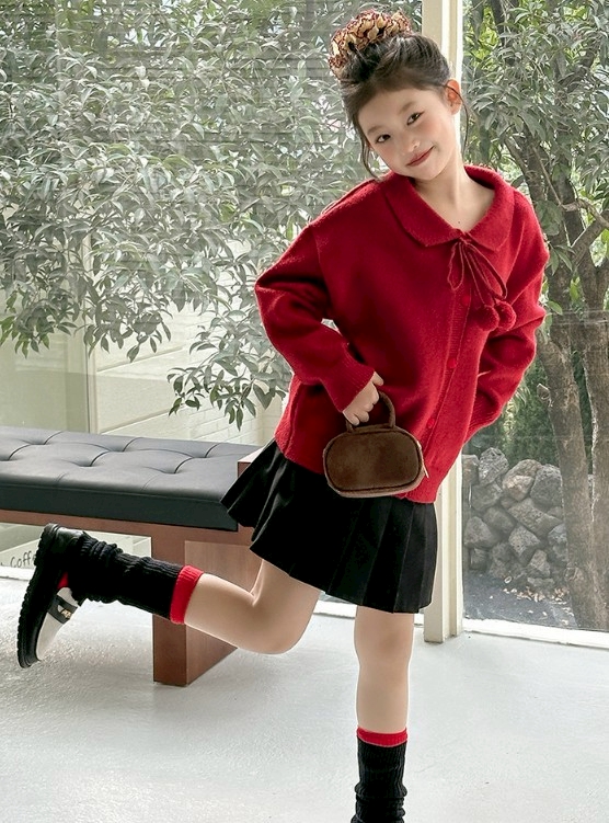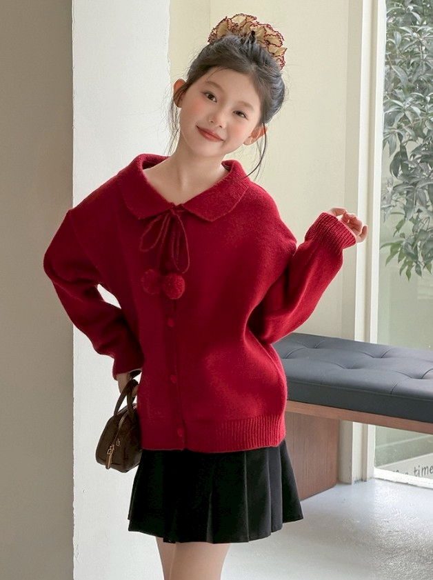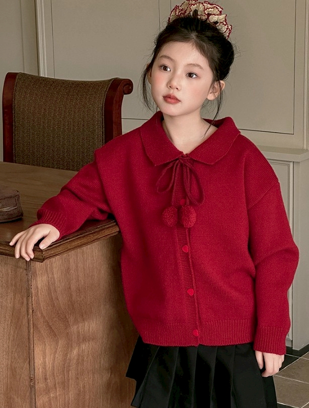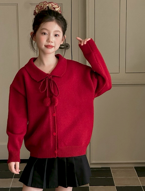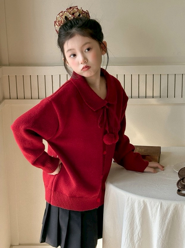 W15 12971 翻領毛球寬鬆新年紅上衣-160CM